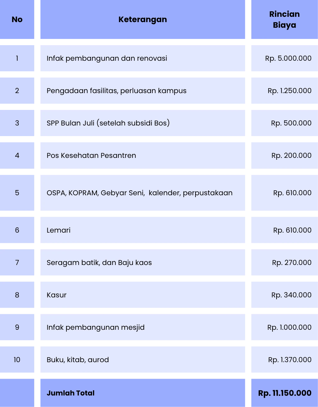 Setelah menerima undangan tes, calon santri diwajibkan membayar biaya tes sebesar Rp.250.000 sebagai syarat mengikuti proses seleksi.